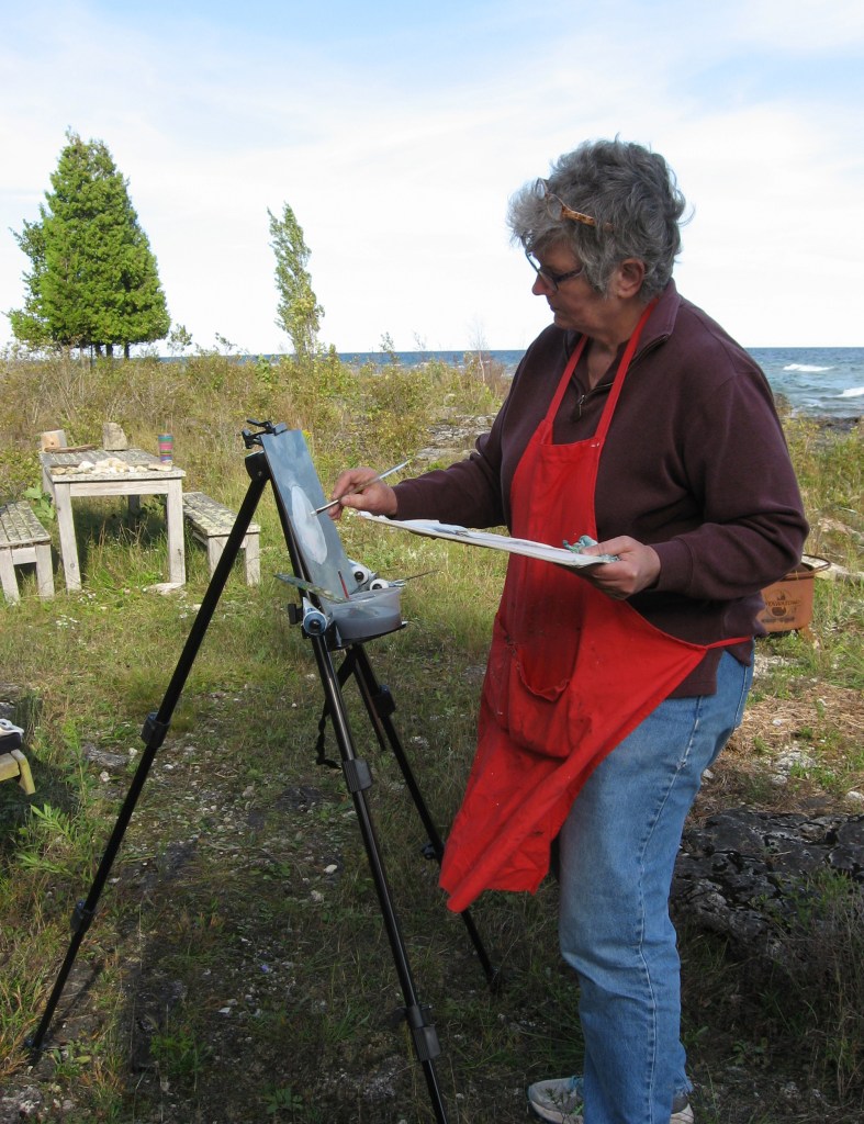 In the field, my work is mostly pen & ink with watercolor. The immediacy of the medium lends itself to quick expression. I also shoot with a Canon Rebel to document light, shadow, and color. Once home in the studio, many of these watercolor studies and scenes are translated into larger, mixed media works of acrylic and collage.